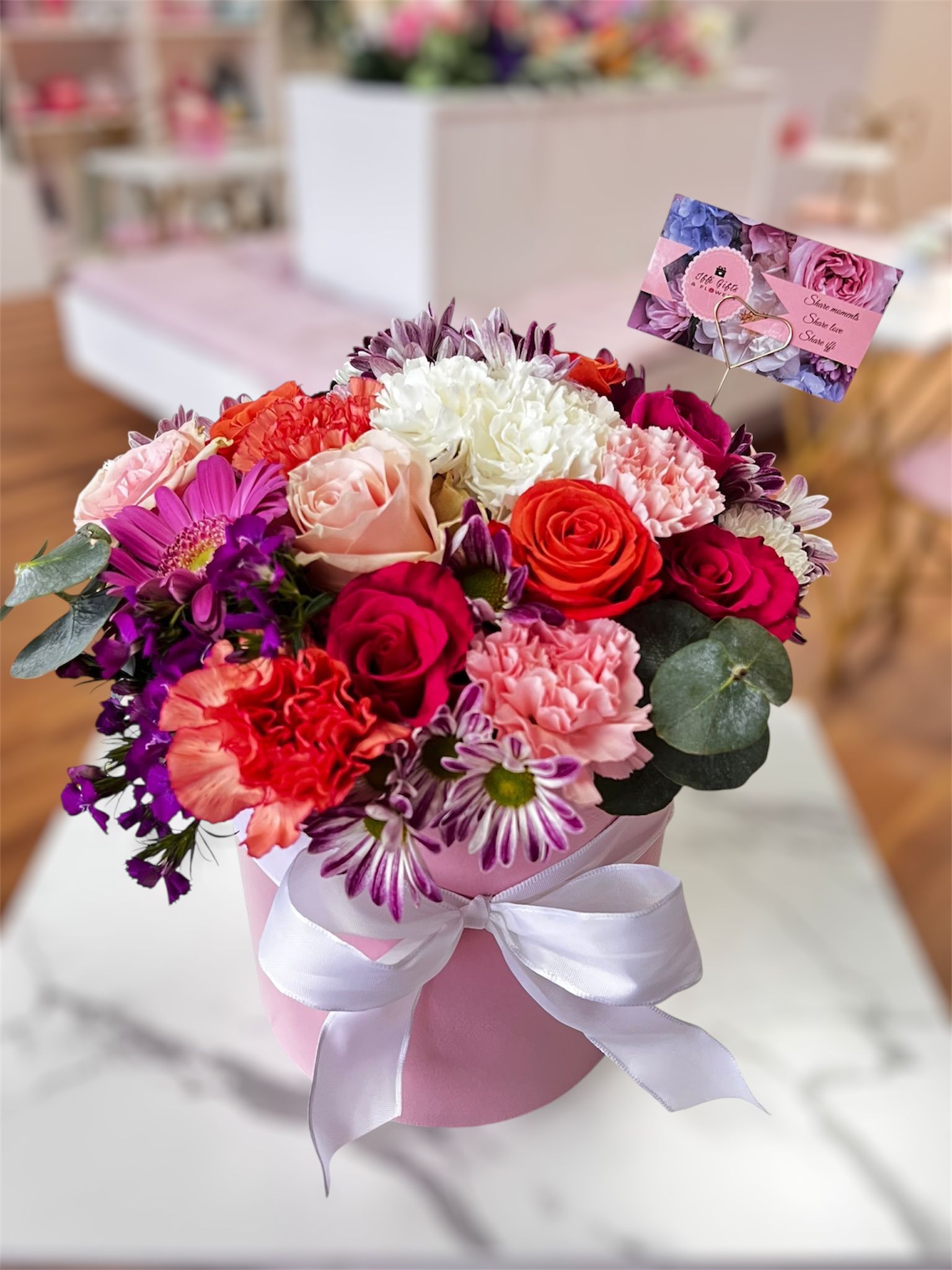 Colorful and charming arrangement of pre-selected fresh flowers, presented in a pink box, the perfect gift for any occasion