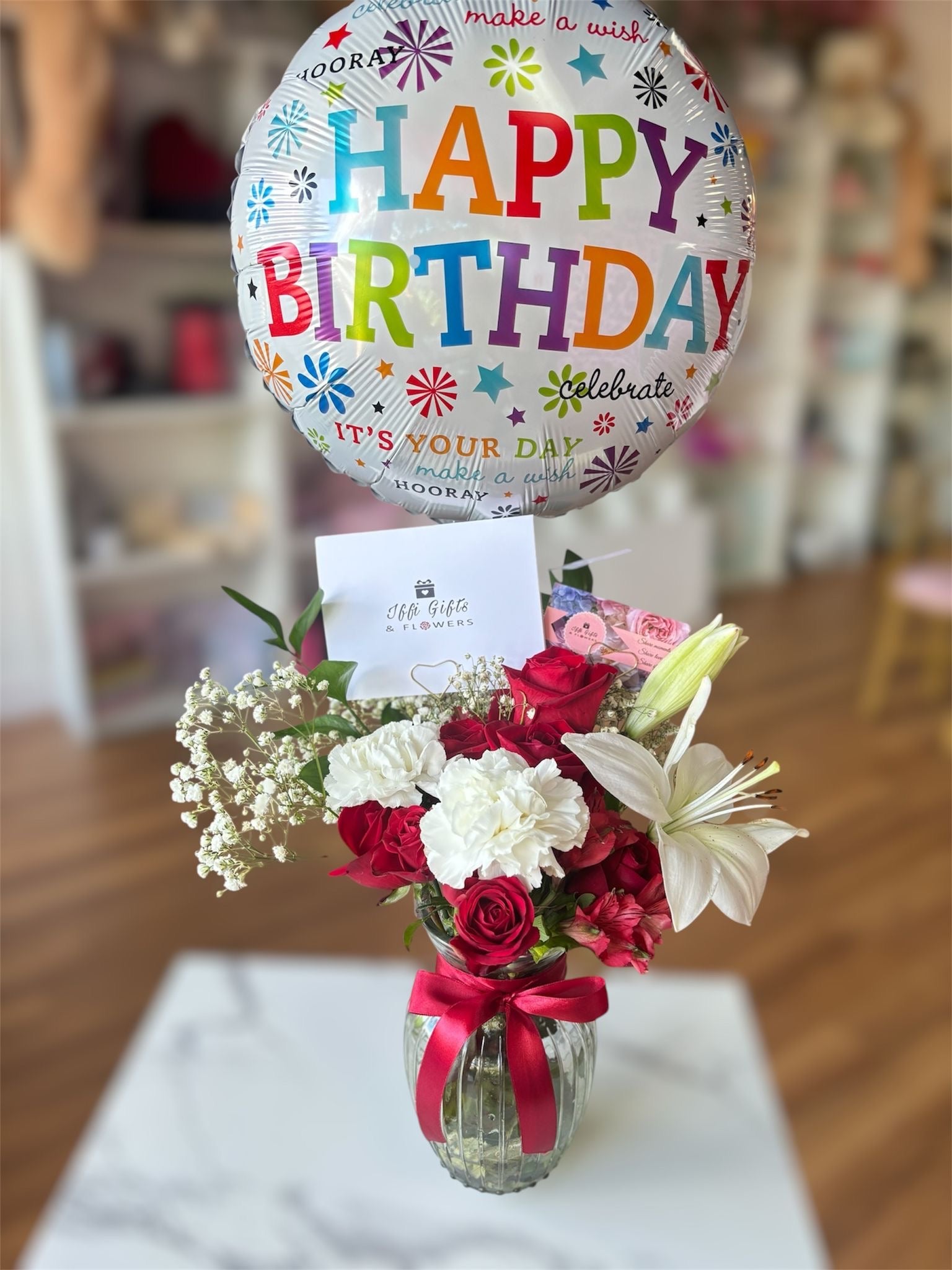 Beautiful assorted flowers previously selected between shades of red and white, presented in a glass vase, with a birthday balloon, ideal to surprise that special person